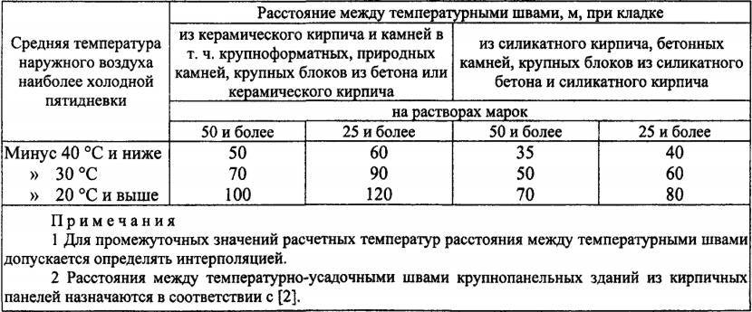 6.4.2. Если условиями эксплуатации допускается наличие трещин с шириной раскрытия до 2 мм, то расстояние между температурными швами принимается согласно СП 15.13330.2012, таблицы 33, как для силикатного кирпича и бетонных камней.