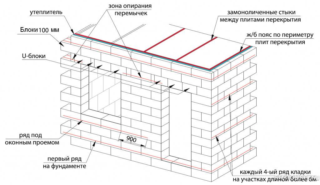 - Проемы в стенах: опорная часть под перемычками, а также нижняя часть оконного проема на всю ширину с добавлением напуска по 0,9 метра в каждую сторону от него;