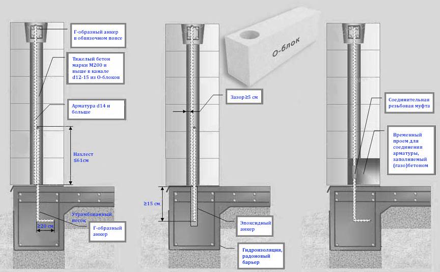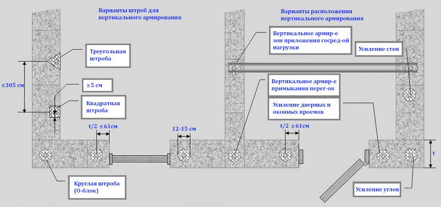 Вертикальным называют армирование, располагающееся в сквозных каналах, устроенных по всей высоте ограждающей конструкции. Формируются такие каналы из пустотелых вентиляционных блоков, которые могут быть не только газобетонными, но и любыми другими (керамика, бетоны с керамзитовым и полистирольным наполнением).