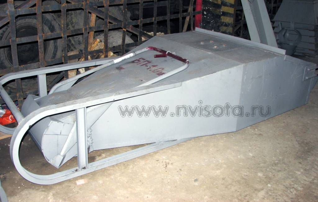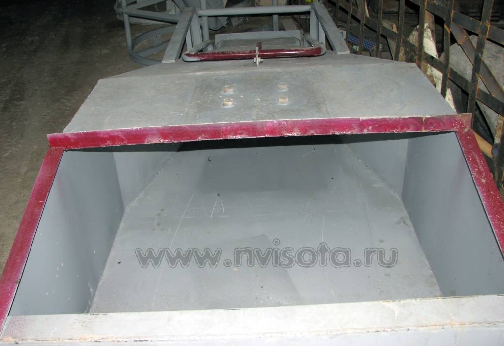 - Корпус – сварная конструкция из листовой стали усиленная стальными швеллерами. Для возможности перемещения корпус «Туфельки» оснащен двумя шарнирными приварными проушинами. На верхней поверхности имеется площадка для установки вибратора. Вибратор используется при временном хранении бетона и для очистки емкости от остатков материала;