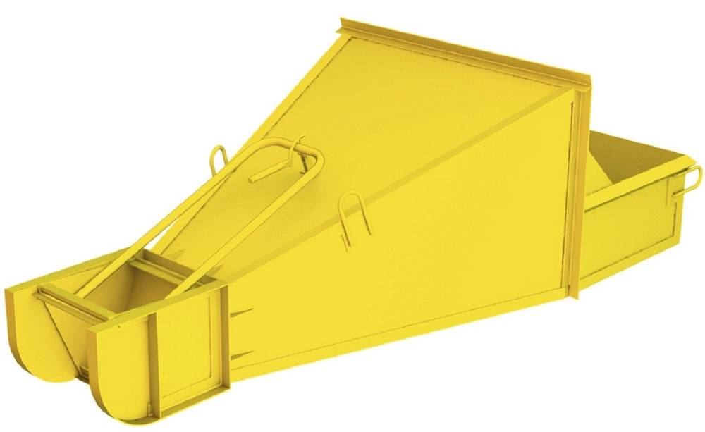 Открытая часть такой бадьи имеет форму прямоугольной призмы, закрытая изготавливается в виде конуса. Загрузка бетона в ёмкость осуществляется в лежачем положении, что достаточно удобно. Выгрузка производится в вертикальном положении, для чего в конструкции бадьи предусмотрены мощные скобы, а на конце конуса – замковый затвор.