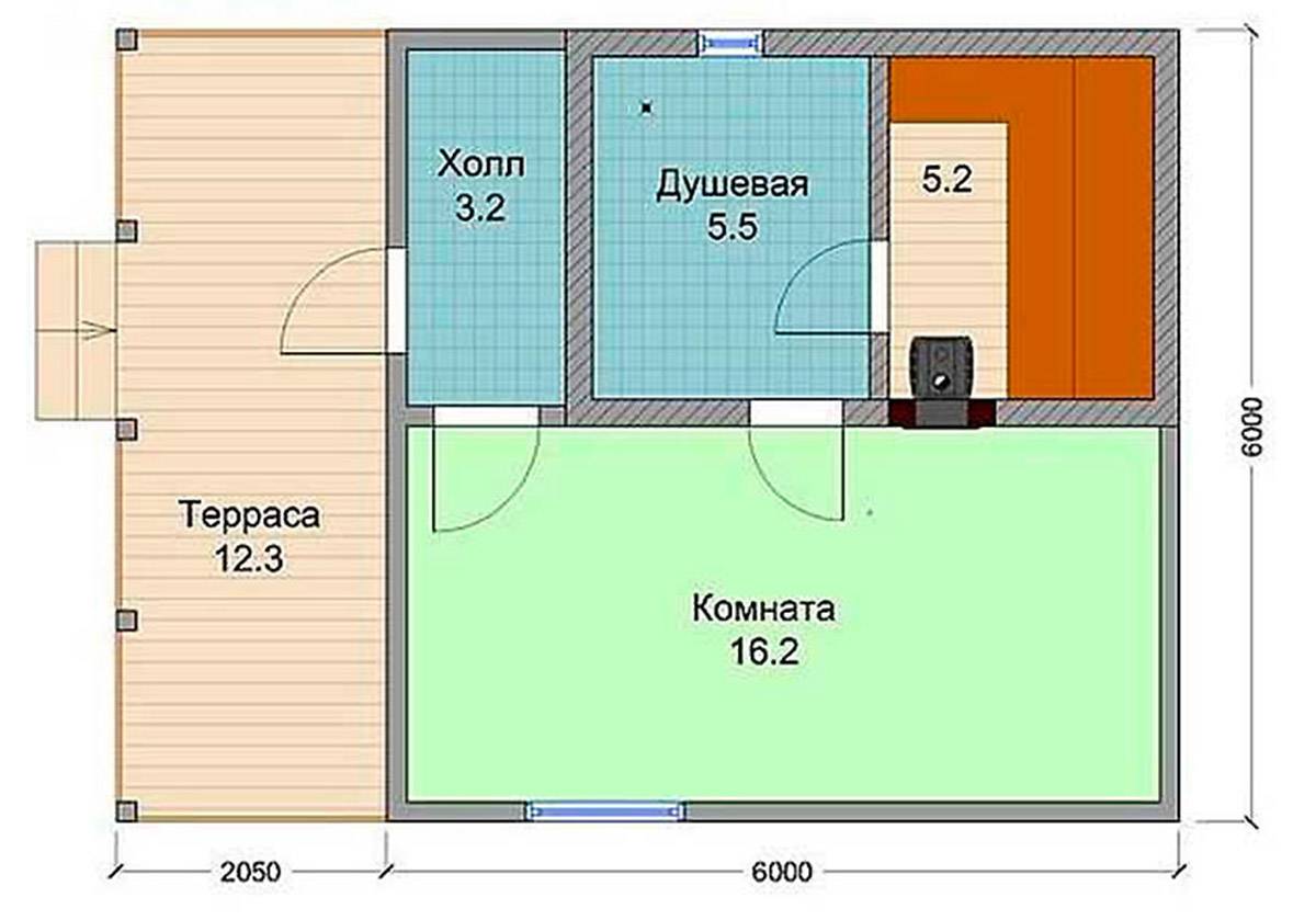 Баня 6*4 – правильный вариант для небольшого участка. Есть возможность разместить небольшую комнату отдыха и даже террасу. По проекту предусмотрено такое: