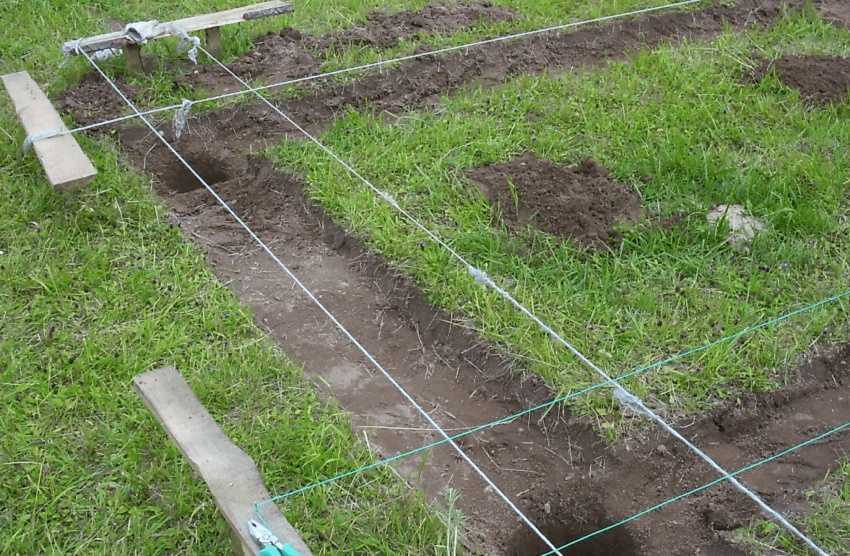 - После разметки участка по периметру будущей постройки ставят колышки и натягивают леску.