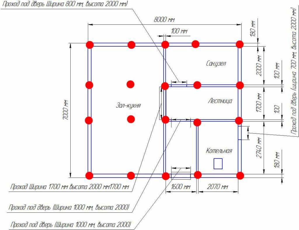 Для составления схемы расположения свайных опор необходимо учитывать, что сваи должны находиться под каждым углом дома, вдоль несущих стен с выбранным шагом, а также под входной группой и тяжелыми конструкциями.