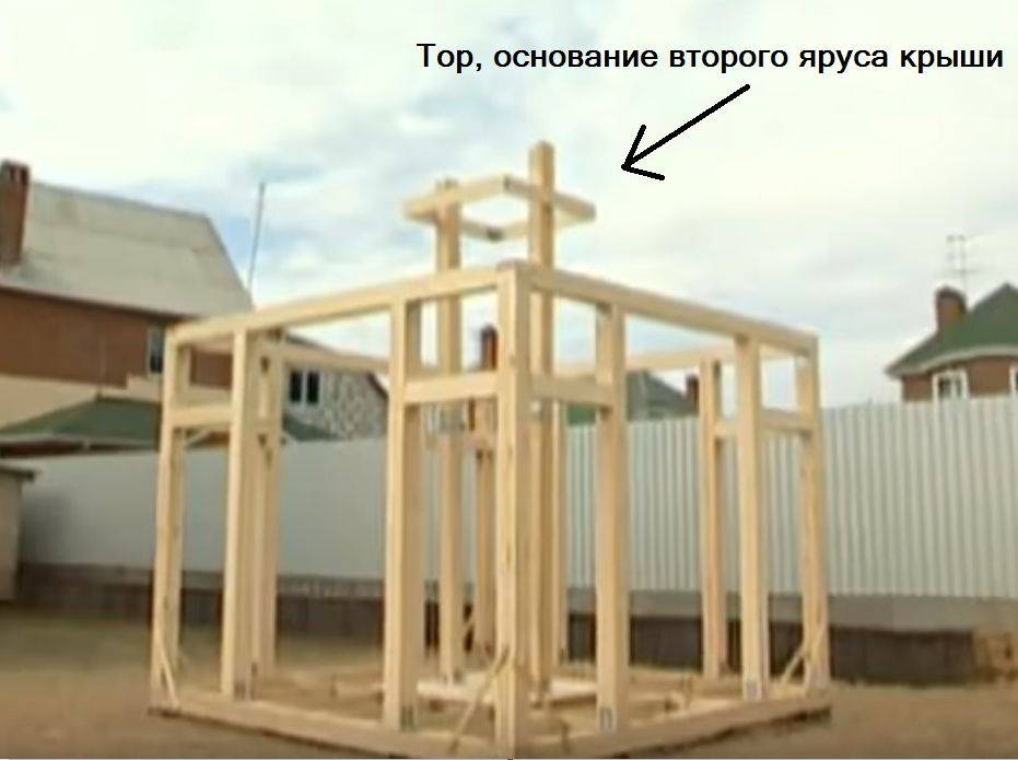 Исходим из того, что основание у беседки уже готово — фундамент надежно залит, а опорные столбы выставлены по уровню. В данном материале предлагается более эстетичный вариант шатровой крыши, нежели в классическом строительстве. По центру будет сделана небольшая башенка, которая подчеркнет уникальность сооружения (в строительстве её называют «тор»).