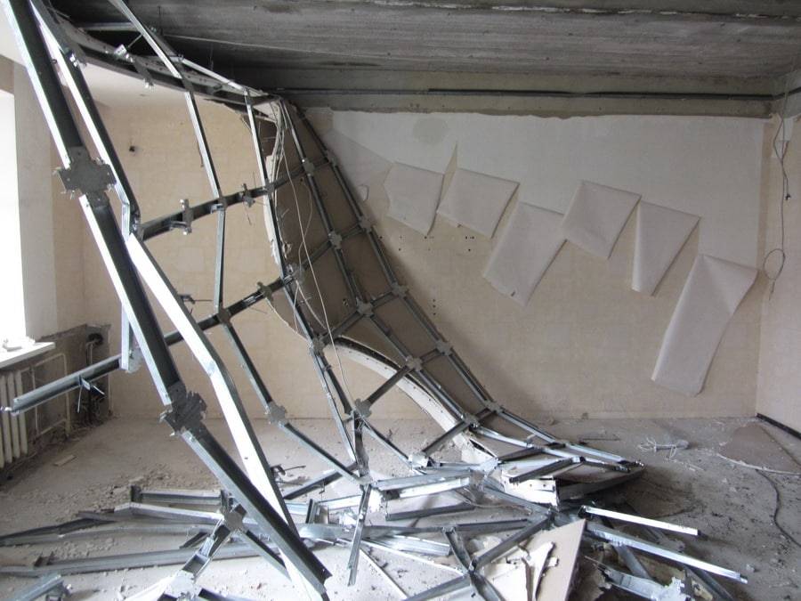 Разборку таких узлов проводят в последнюю очередь. Работы по снесению и видоизменению фальш-стен из гипсокартона любой формы не требуют разрешений надзорных органов, поскольку не вносятся в техплан, и к несущим не относятся.