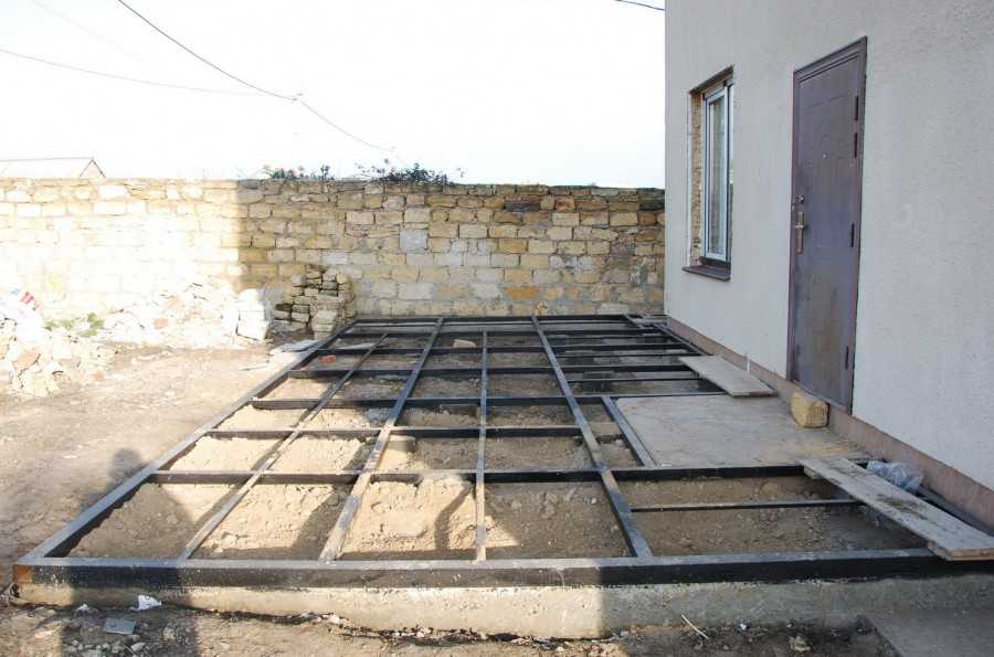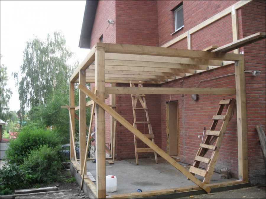 - каркас ее кровли со стороны примыкания должен крепиться к внешней стороне капитальной стены дома. С другой стороны, каркас кровли должен опираться на опоры, вмонтированные с помощью бетонной отмостки, в грунтовое основание на глубину от 40 см и более.