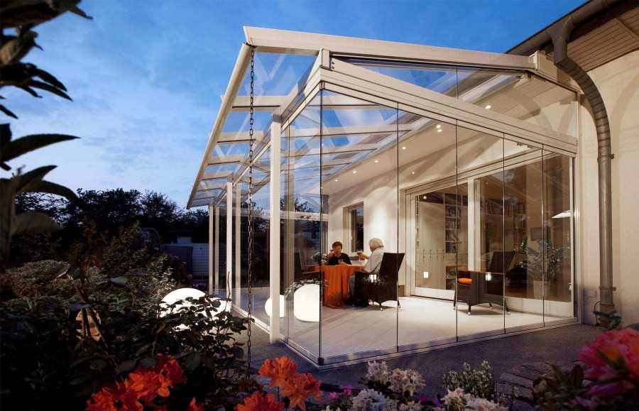 Минус же только один: парниковый эффект, который неизбежен при таком виде отделки. Особенно, если и крышу террасы сделать из оргстекла или поликарбоната. Поэтому оптимальным вариантом будет комбинированный вариант — из стекла и глухих блоков. А добавить «живого» воздуха помогут раздвижные двери и складные перегородки или даже стены. Последние вообще могут подниматься вверх наподобие гаражных ворот.