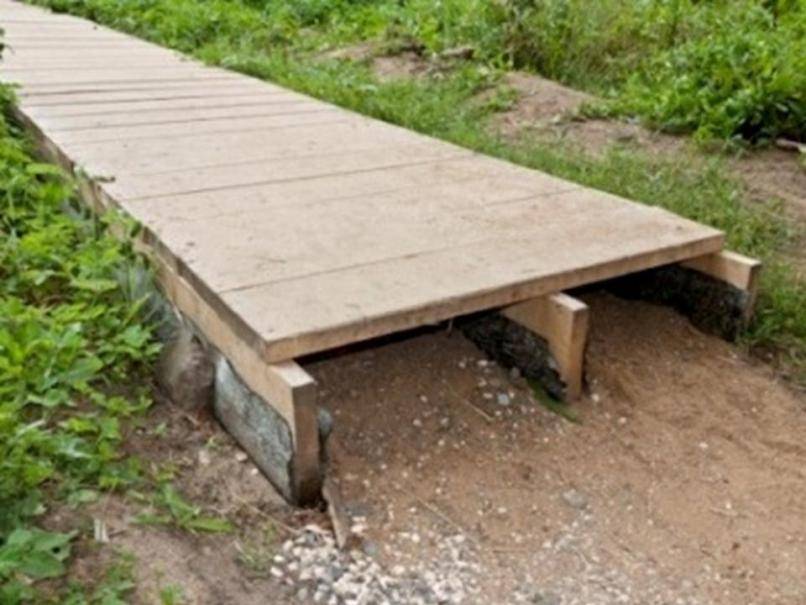 Если дорожка будет из досок, которые укладывают сплошным полотном, то способ ее устройства немного отличается. Желательно сделать ее немного приподнятой (около 10). Такая воздушная прослойка позволит дереву быстрее высыхать после дождя, да и отсутствие контакта с почвой положительно скажется на долговечности настила.