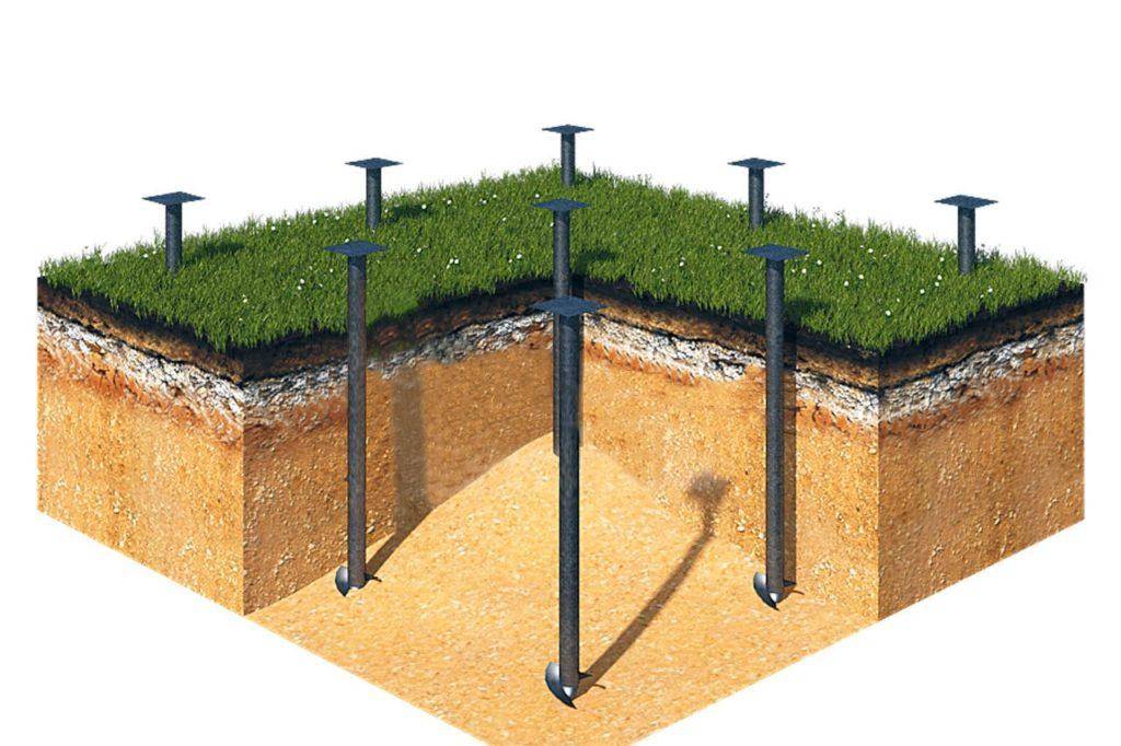 Свайная конструкция устраивается практически также, как столбчатая. Единственным отличием является то, что элементы в этом случае не просто углубляются в землю, а ввинчиваются. Это возможно благодаря тому, что на конце каждой сваи имеется бур.
