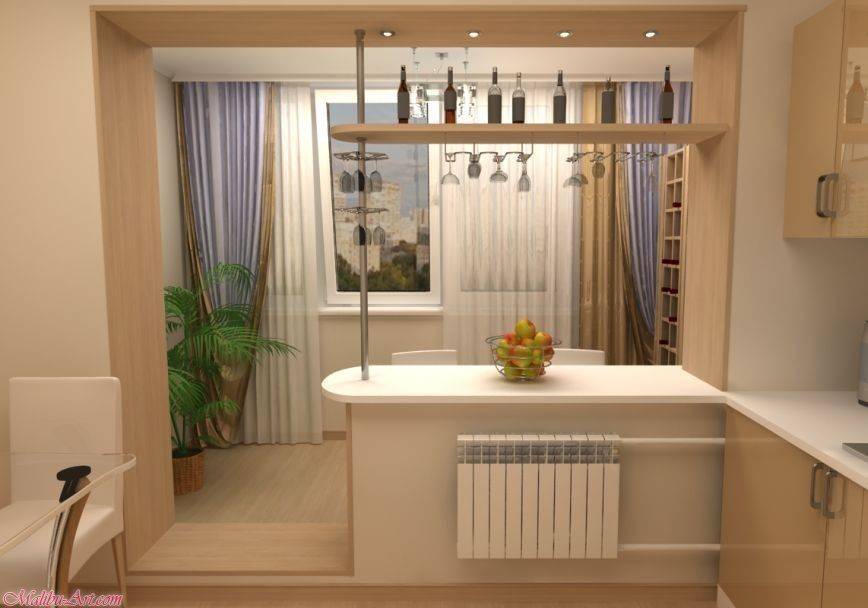 Одно из самых популярных решений для небольших кухонь. На балкон можно вынести обеденную зону, кухонное рабочее пространство или барную стойку с холодильником и полками для хранения.