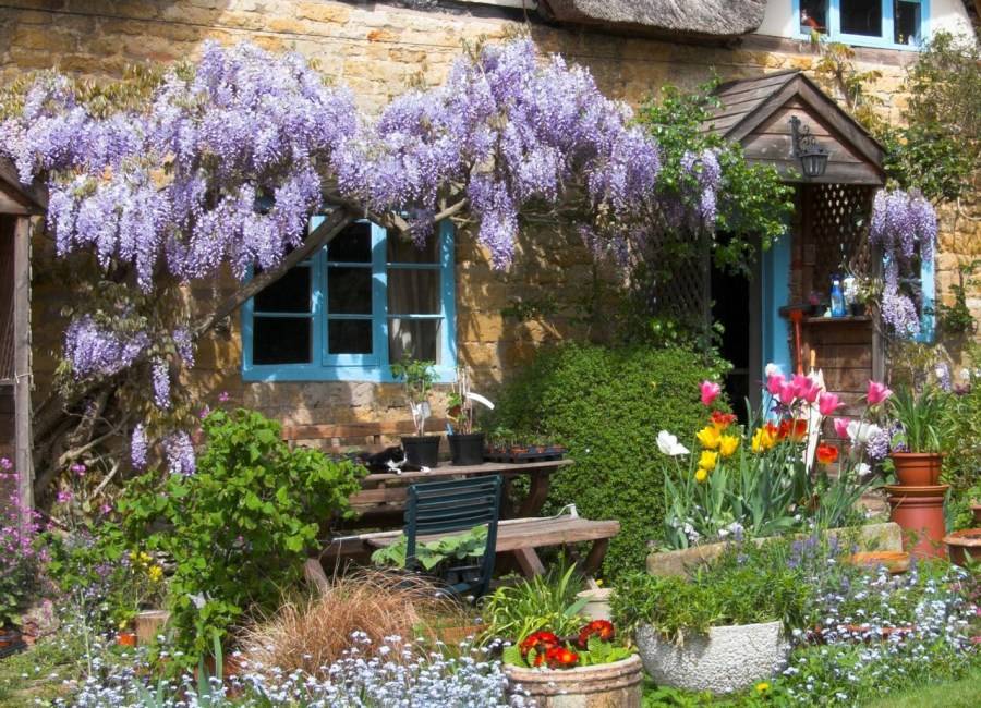 Деревенский кантри. В основе стиля лежит простота, естественность, нарочитая небрежность и хаотичность. Для оформления ландшафта нужно использовать природные материалы – к примеру, для дорожек – натуральный камень, между которым поросла трава, для заборов, лавочек – натуральную древесину. На клумбах высаживать можно полевые и дикие цветы, совмещая с культурными видами. Для декора участка можно использовать подручные предметы быта – корзинки, тележки, глиняные вазоны и горшки и пр. Использовать для озеленения дорогие, экзотические растения или стелить строгий идеальный газон не стоит. Деревенский кантри прост в реализации для начинающих.