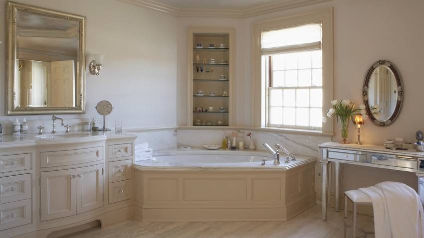 Очень повезло тем, кто имеет просторные ванные комнаты. В таком случае совсем не обязательно выбирать непосредственно прямоугольную ванну. Здесь будет прекрасно смотреться какая-то иная форма.
