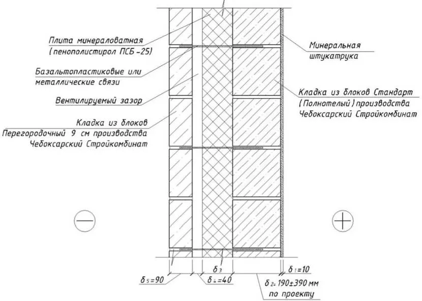 - Внутренняя отделка – штукатурка без армирования; размер несущей стены – 45/19/24 см; кладка – в перевязку; теплоизоляция – минеральная вата или пенополистирол слоем 5 см с теплопроводностью 0,05В т/м;