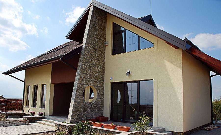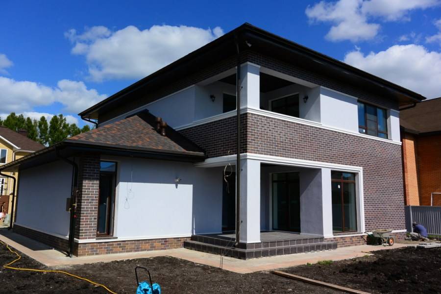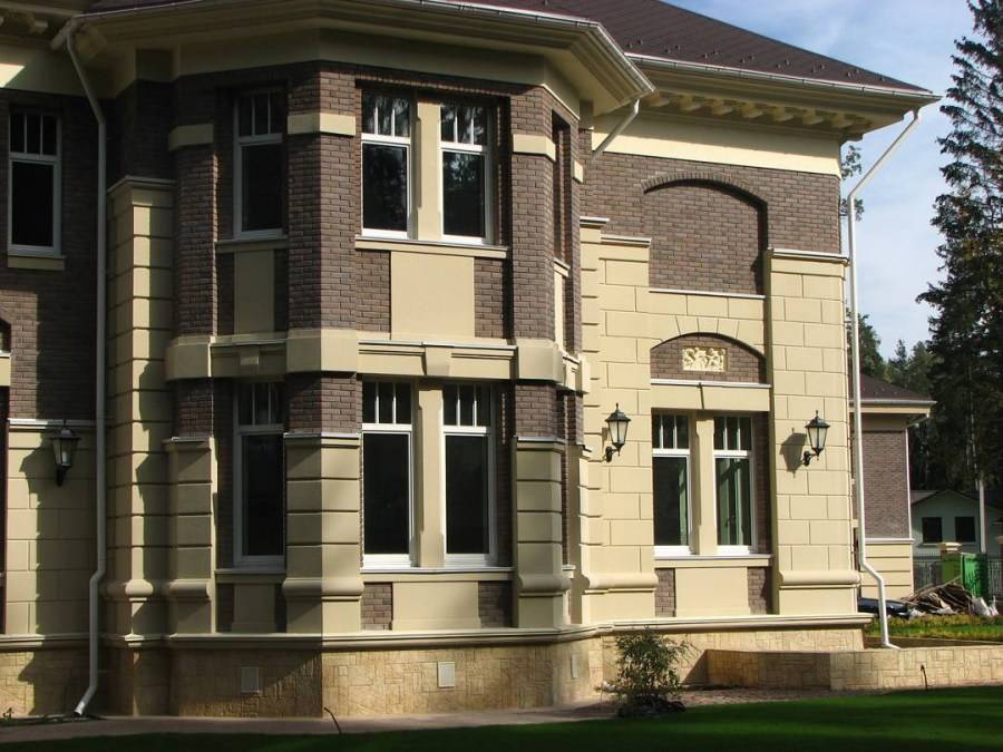 Кирпич, натуральный камень, сайдинг, мозаичные плиты, штукатурка, мрамор, термопанели – это всего лишь малый список материалов, которые могут быть применены для отделки фасадов такого типа.