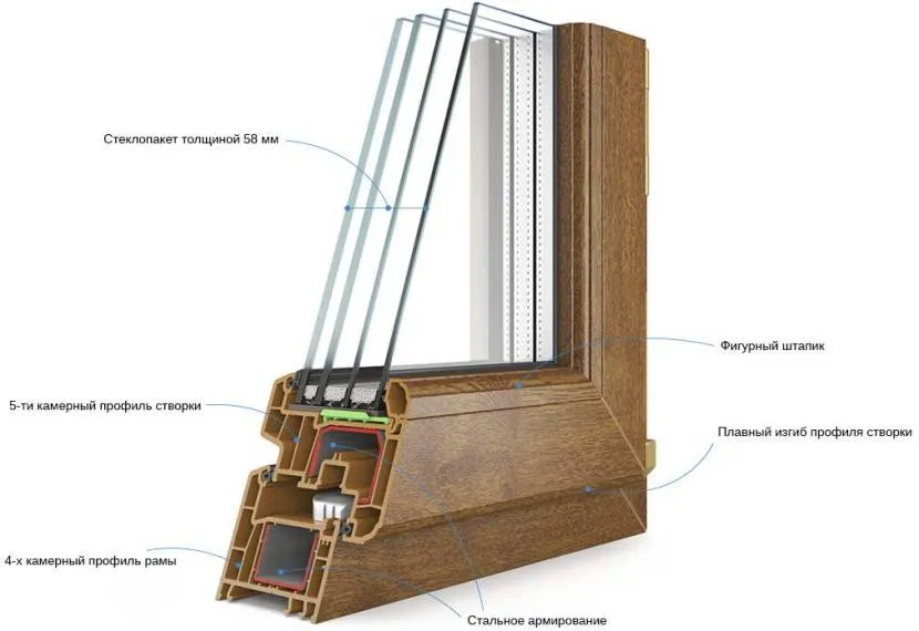 Чтобы конструкция была жёсткой, пластик не поддавался деформации, внутрь по периметру устанавливается металлический каркас. Благодаря ему сохраняется форма оконной рамы, не образуются вмятины в связи с эксплуатацией оконных створок, воздействия температур.