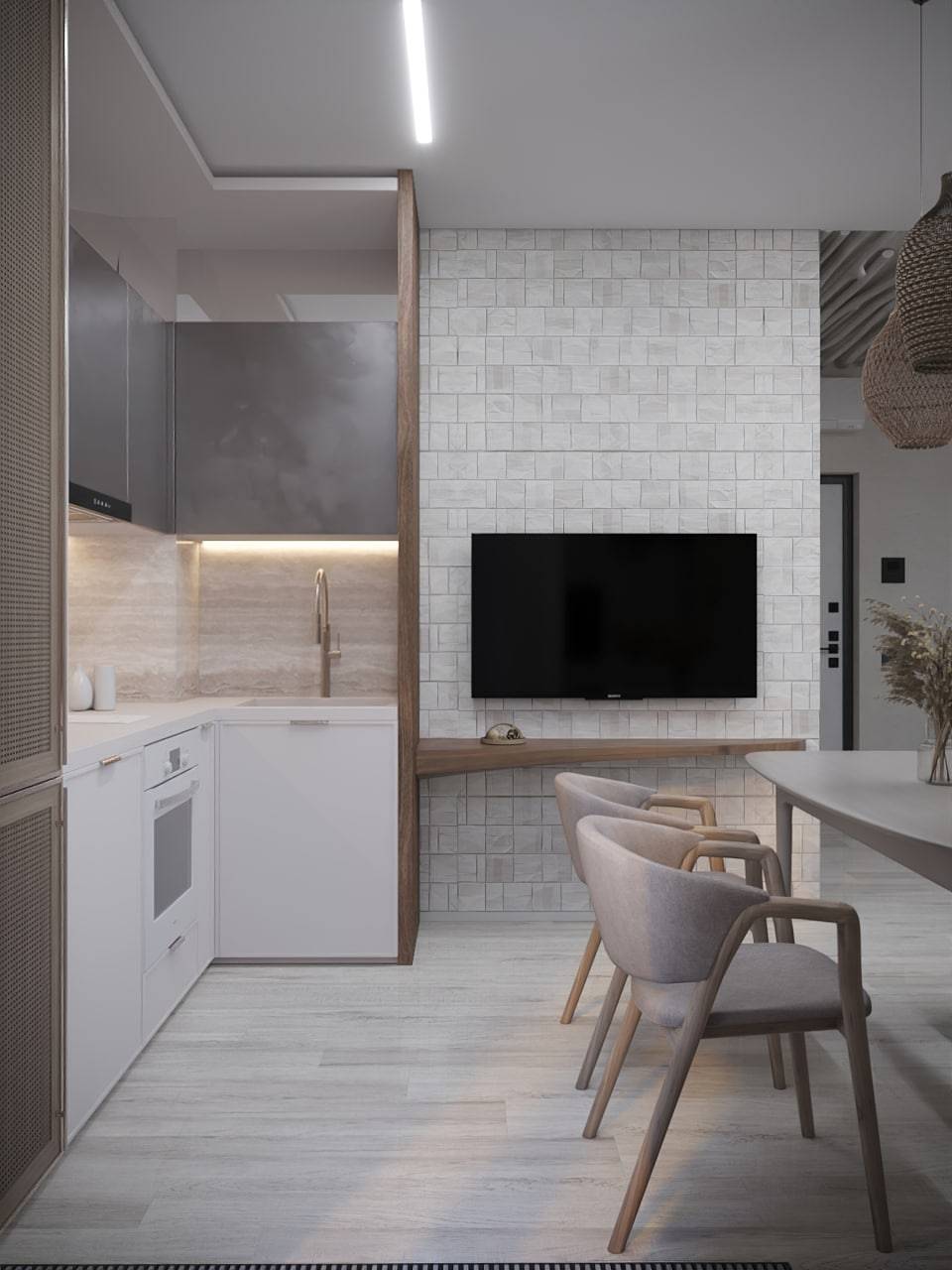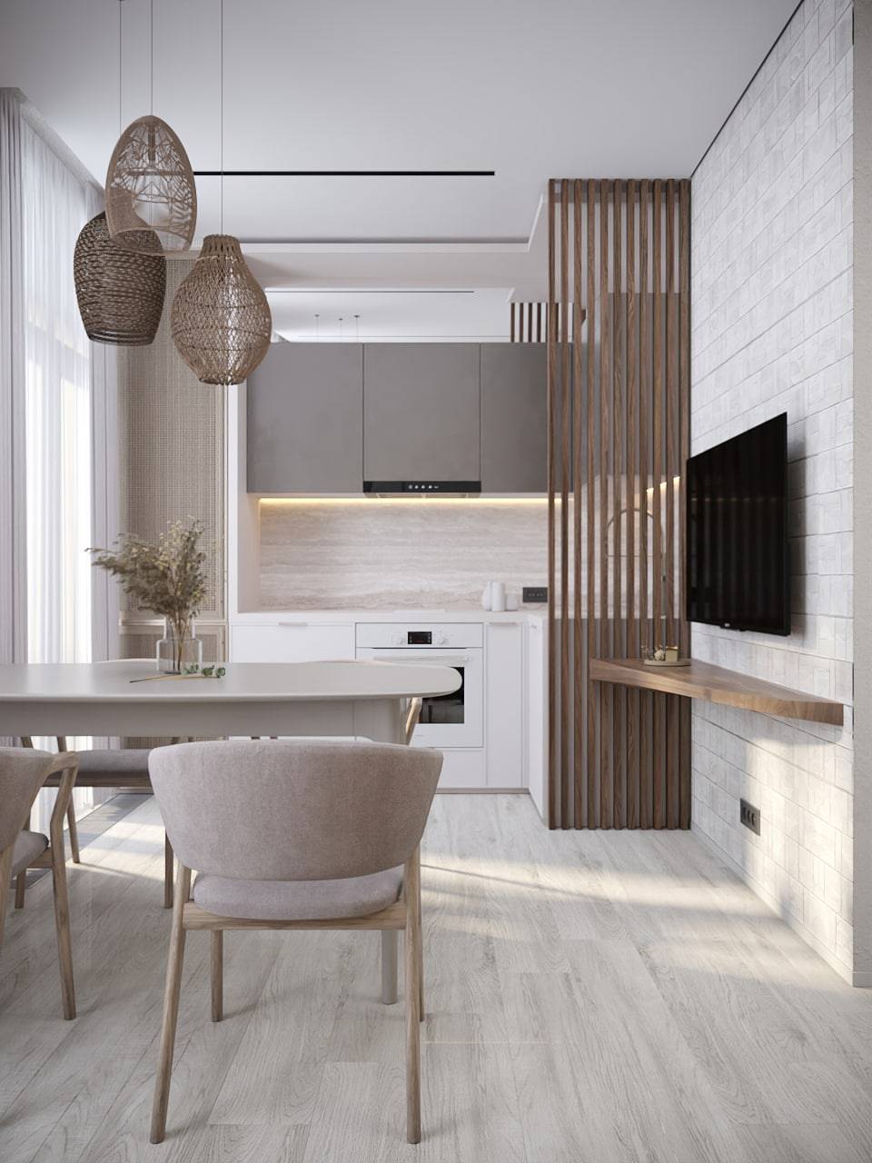 - В идеале, обеденная зона должна находиться в другой комнате, а не на кухне, но, к сожалению, такой вариант не всем подходит из-за маленькой площади квартиры. Для обеденной зоны потребуется всего-навсего стол и стулья.