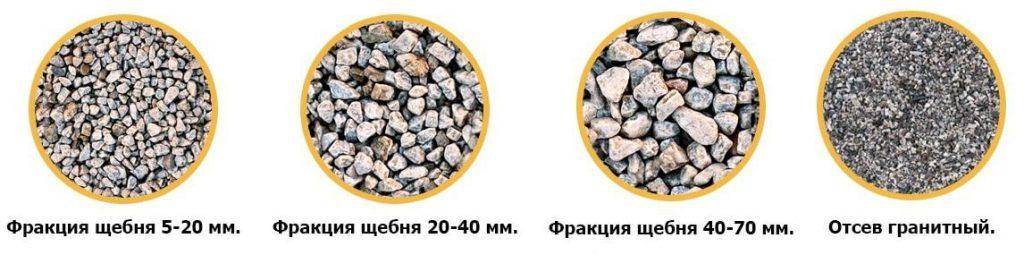 Фракции этого щебня: 0-5 мм, 5-10 мм, 5-20 мм, 20-40 мм, 40-70 мм, 70-120 мм. Наиболее востребованным на рынке считается гранитный щебень фракции 5-20 мм, применяющийся в производстве бетона и асфальта.