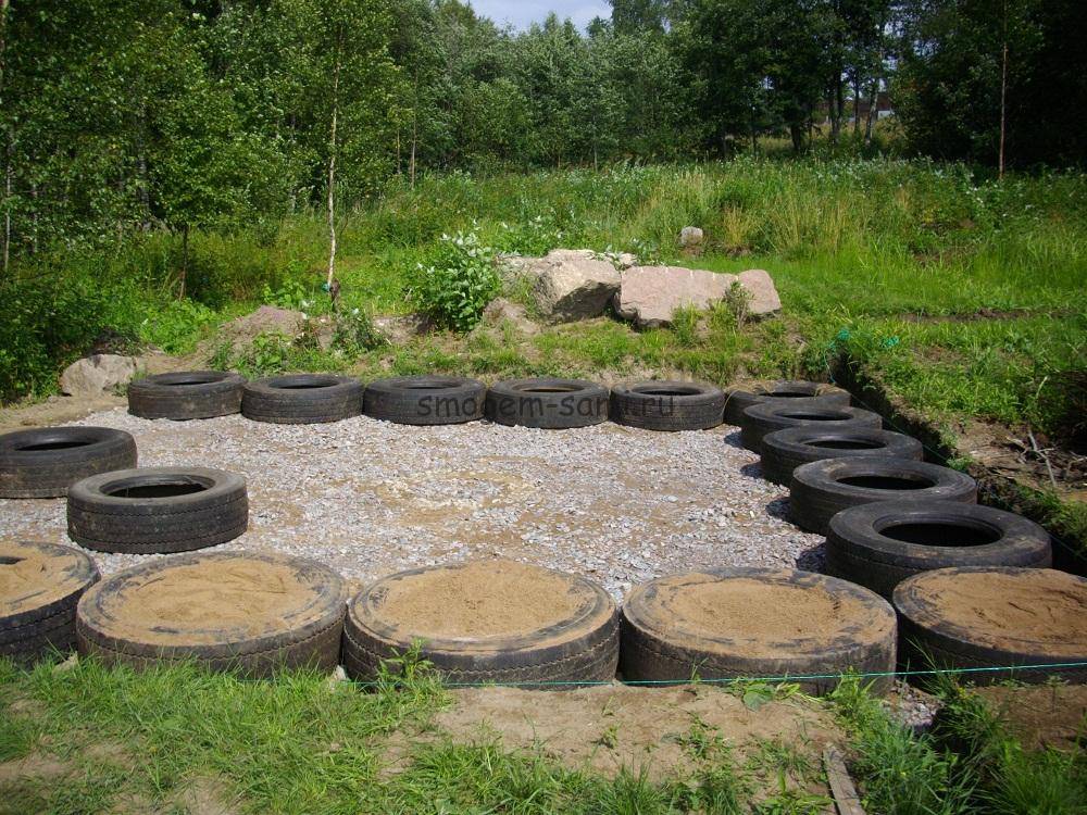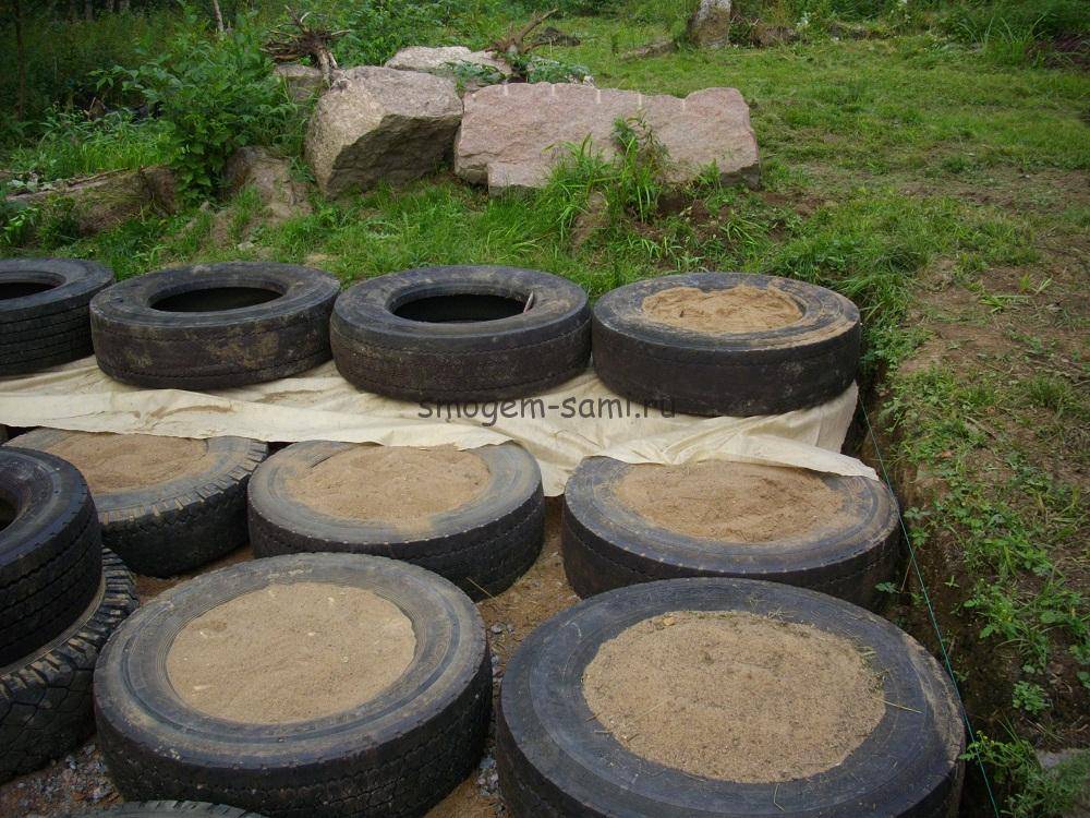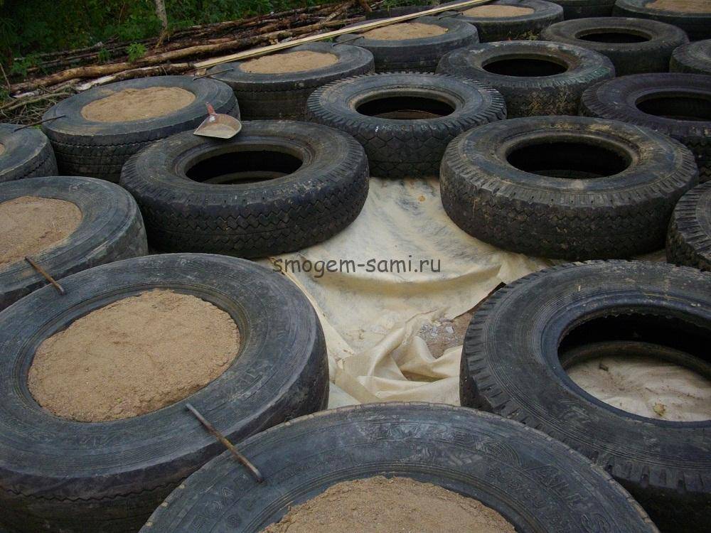На выравненную по нивелиру площадку укладывают встык в два слоя авто либо тракторные покрышки (изношенные), заполненные на 50…80% объема однородным грунтом.