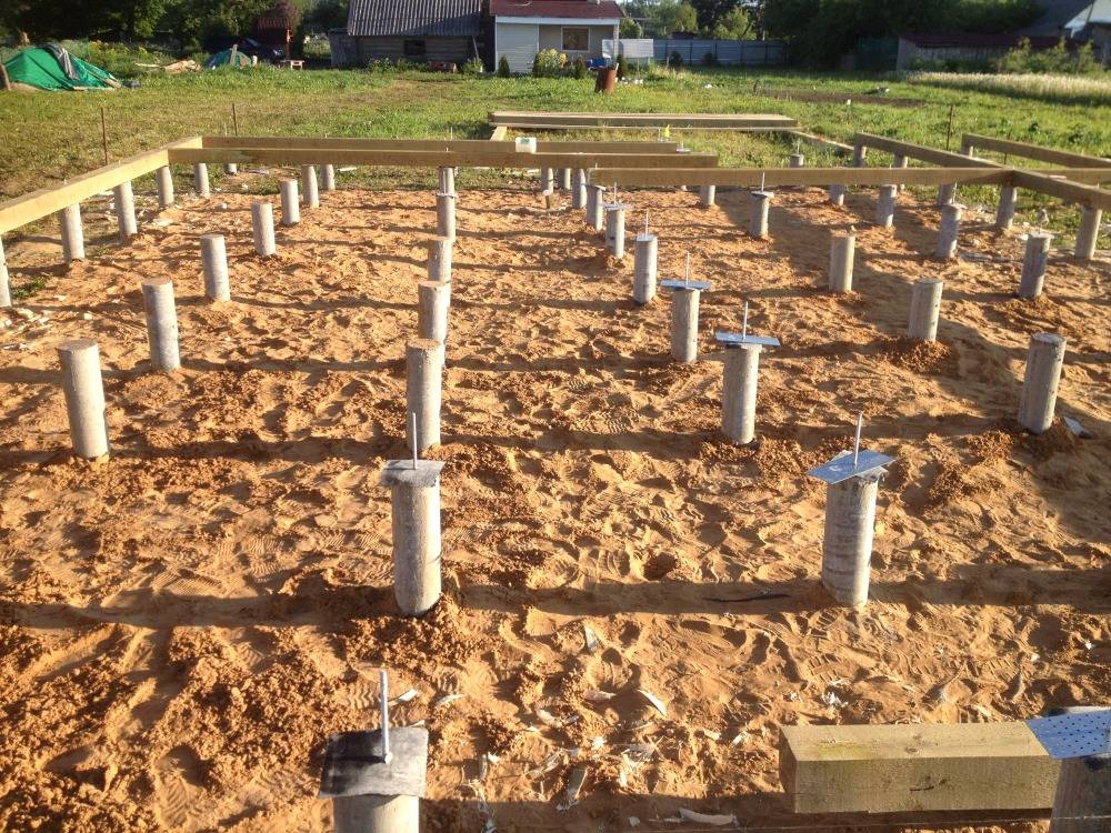 Экономичный вариант основания, который хорошо подходит для строительства бани на глиняных и песчаных почвах. Одно из преимуществ фундамента в том, что он позволяет выполнить закладку труб канализации не заранее, как в случае с ленточным основанием, а уже после укладки – в процессе обвязки столбов.