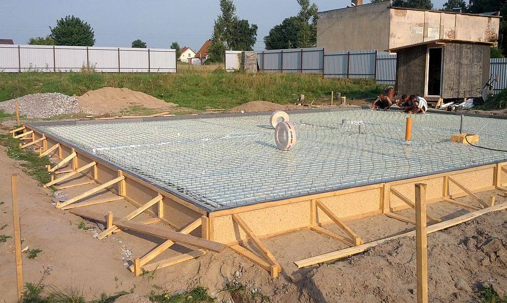 Данный тип фундамента требует обустройства качественной основы. Для этого необходимо в соответствии с существующими требованиями и правилами соорудить монолитную плиту из прочного и долговечного бетона. Заливка и армирование проводятся в соответствии с разработанной технологией: