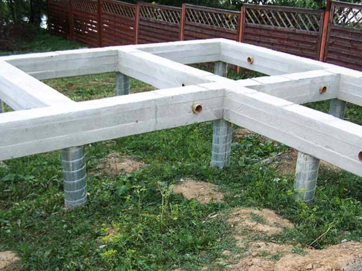 Фундаментная лента (ростверк) опирается на сваи, выступающие над грунтом на 15 — 20 см, что исключает давление замершего грунта на ростверк.