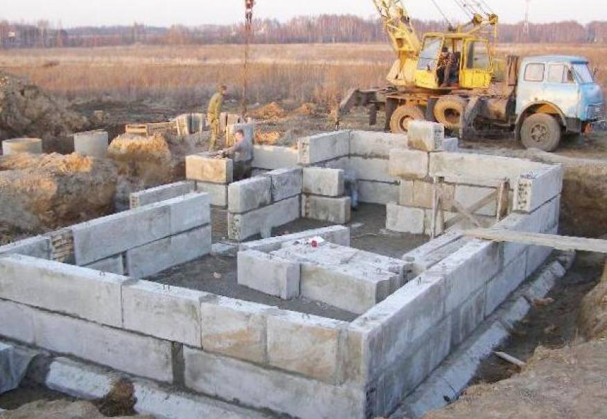 Установка фундамента из бетонных блоков. Очень крупные блоки придется монтировать с помощью техники.