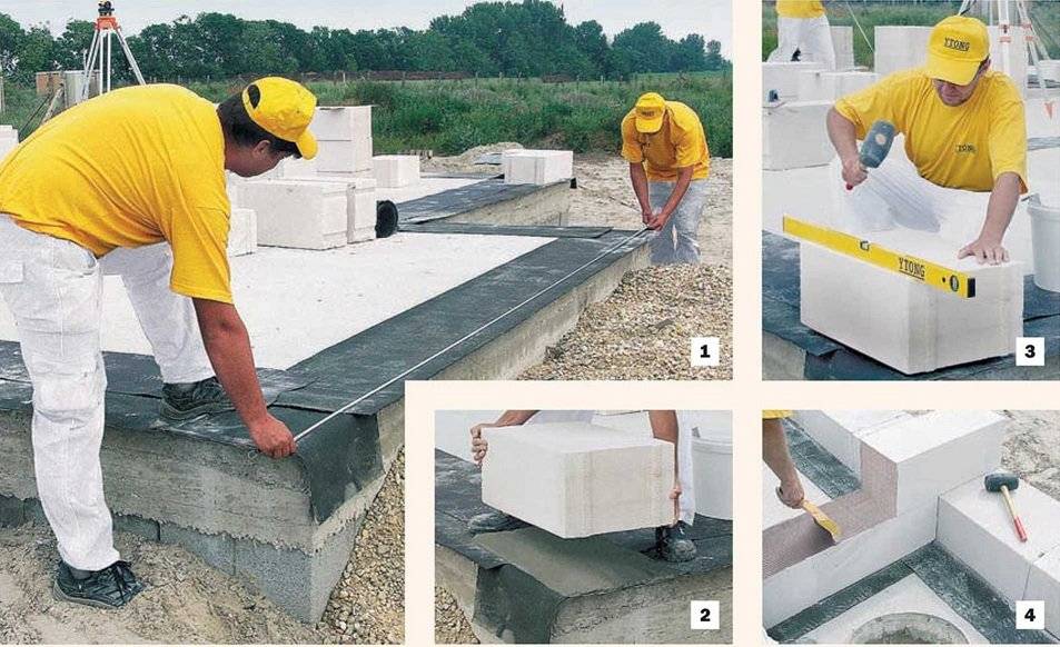 Первый ряд газобетонных блоков выкладывается на цементно-песчаную подушку, уложенную поверх гидроизоляции — двух слоев рубероида. Гидроизоляционный материал помешает стенам мокнуть, впитывая воду из фундамента и грунта благодаря капиллярному эффекту.