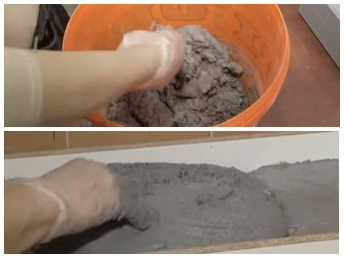Все сыпучие вещества, входящие в состав геополимера, нужно смешать в отдельной емкости из укрепленного стекла, после чего аккуратно влить в них воду, охлажденную до комнатной температуры. Во избежание неравномерного твердения, раствор помешивается деревянной лопаткой, пока не станет полностью однородным.