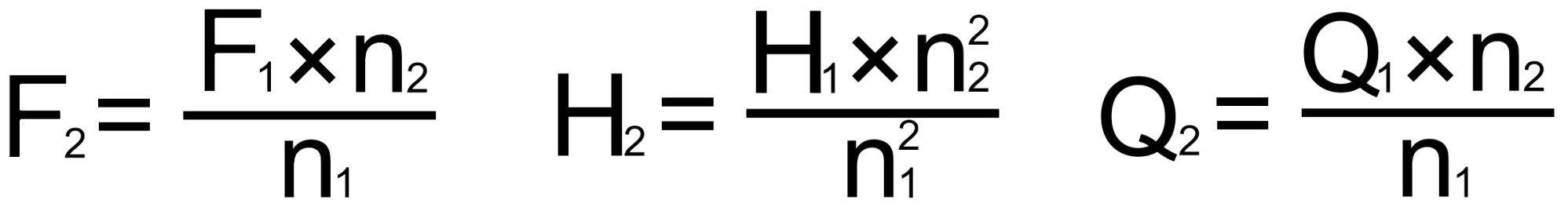 Далее, нужно ввести новые обороты электор двигателя, при которых должны расчитываться параметры. Все вычисления происходят по формулам, представленым ниже. Три нижних пустых поля используются для вывода результатов. Также вы сможете увидеть всё на графике. Индексами 1 и 2 помечены начальные и новые параметры соответственно. Для того, чтобы подсчитать напор или подачу, в обязательном порядке необходимо заполнить исходную подачу, исходный напор, обороты электродвигателя исходные n1 и новые n2.