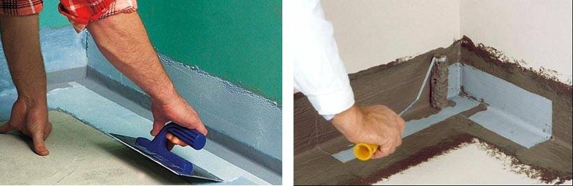 Обмазочным методом можно провести изоляцию ванной комнаты. Раствор наносится равномерно и заходит на стены