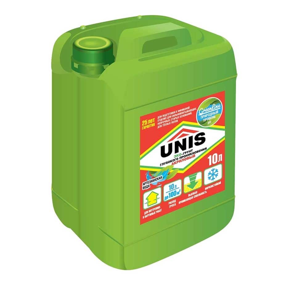 «Юнис». Праймер «Unis» глубоко проникает в структуру материала, благодаря чему укрепляется поверхность рыхлых и пористых материалов, заделываются микротрещины и поры, выравнивается основание под окрашивание, увеличивается сила сцепления с последующей отделкой.