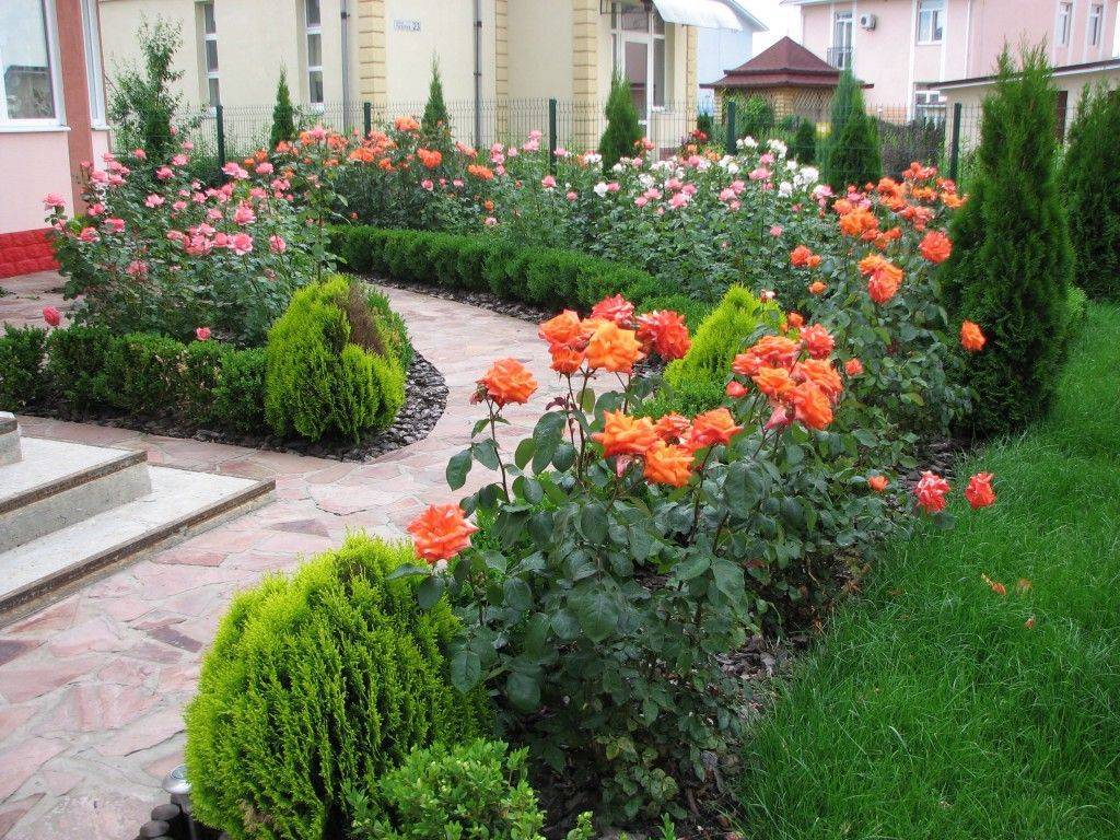 Вечнозеленые клумбы для дома на саду часто ставят вдоль стен, возле входа или по периметру участка. При этом выбирают цветущие миниатюрные кустарники. Размещают их по центру композиции. Вокруг можно высаживать травянистые растения и яркие цветы.