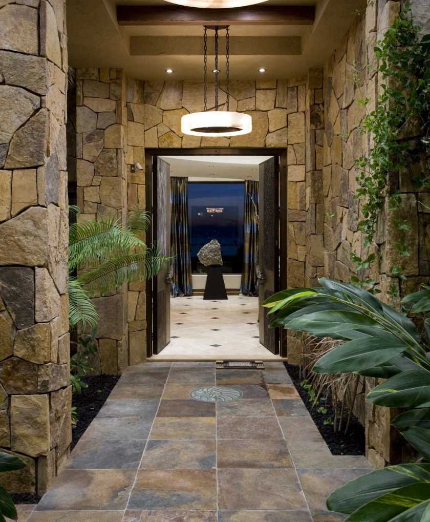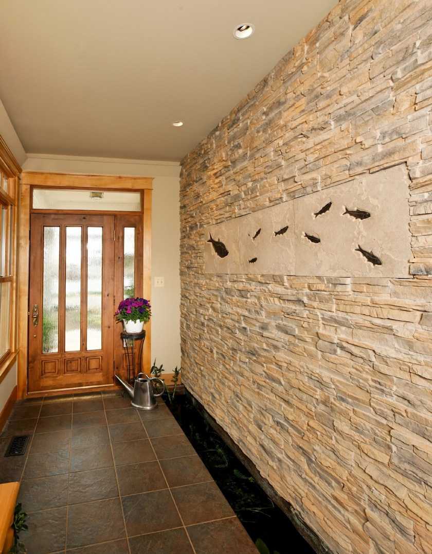 - Не рекомендуется использовать камень холодных оттенков в прихожей, так как в ней не хватает натурального освещения и теплого света. Камень теплых оттенков поможет возместить недостаток солнца.