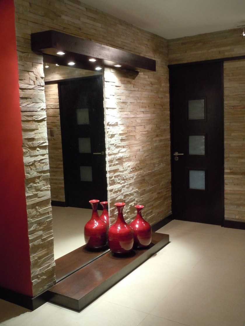 - Отделка одной стены. Даже если вы всей душой полюбили декоративный камень, то не спешите украшать им весь коридор. После такого эксперимента он может стать на дикую пещеру, а от изобилия камня в глазах начнет рябить. В этом случае лучше отделайте одну стену, будь то стена с входной дверью или прилегающая стена.