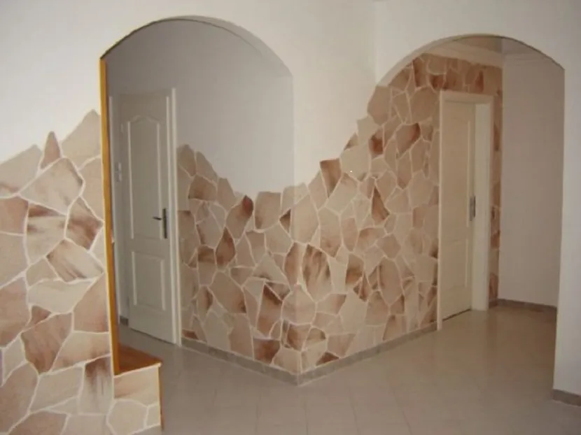 Если вы украшаете обоями под камень гостиную или спальню, то лучше выделить сложным и характерным узором лишь одну стену, но в прихожей, такой материал подойдет и для украшения всего пространства.