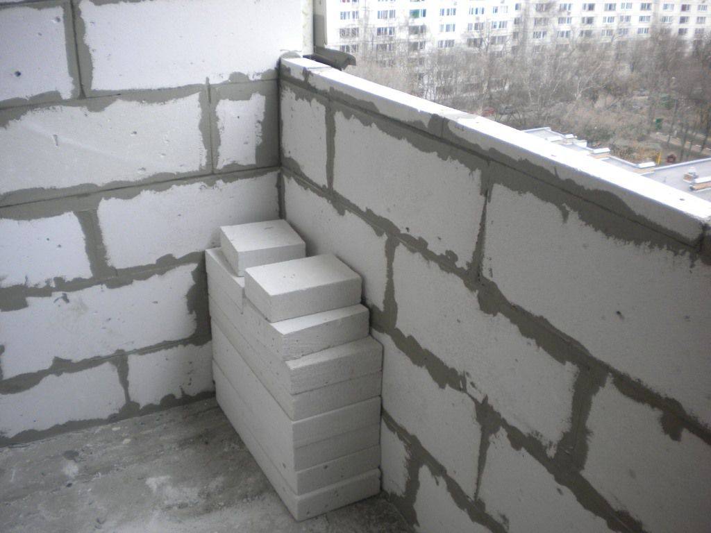 Если парапет металлический, а его уровень не совпадает с верхним перекрытием, то вначале проводится кладка этого элемента и боковых стенок. Желательно использовать для этого пеноблоки, хотя вполне подойдет и керамический кирпич. Наружная поверхность отделывается сайдингом, что тоже немного утеплит лоджию.