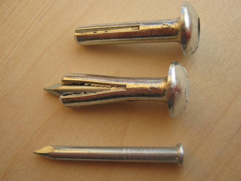 Крепится забивной дюбель с помощью подходящего по диаметру сверла. Проделав отверстие в стене, забивается сначала пластиковый дюбель, а потом необходимо установить сверху деталь, следом закрепить металлический дюбель.