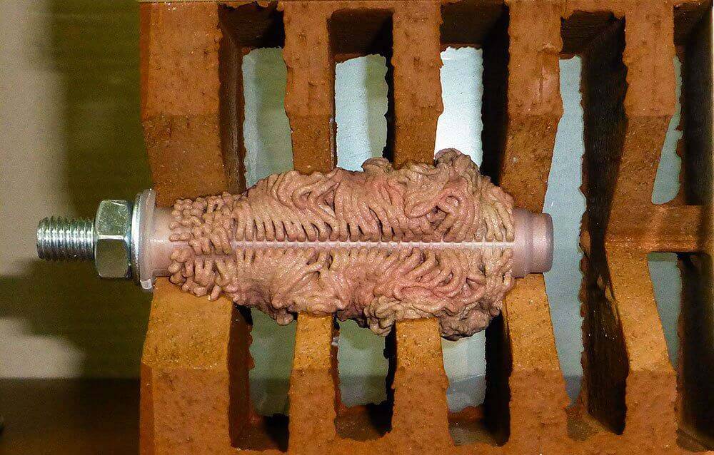 Когда металлический дюбель вкручивается, он плавно проникает в пористую структуру и прочно фиксируется благодаря ребристой поверхности.