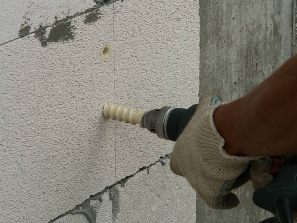 В зависимости от вида теплоизоляции, подбирают дюбель. Изначально с помощью дрели и перфоратора просверливается отверстие в стене, следом вставляется пластиковый дюбель. Потом забивается гвоздь, в этот момент дюбель в стене расширяется на конце и происходит плотная фиксация.