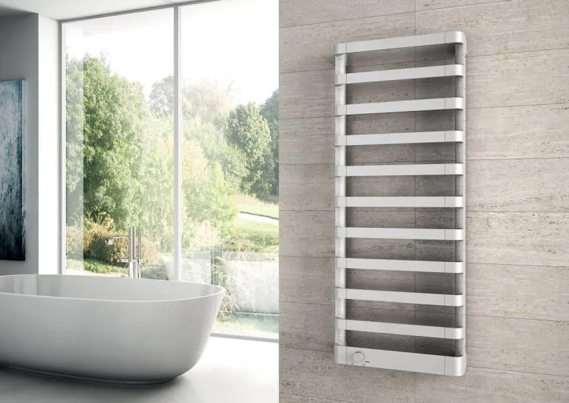 Еще один вид дизайн-радиатора – электрический. Функционирует от сети и больших мощностей не потребляет (как и обычная лампочка). Нагревательные элементы заполнены водой или маслом. Переключатель-термостат позволяет регулировать его работу. Температуру в ванной можно поддерживать в диапазоне 5-30 градусов с плюсом. Стоимость оборудования достаточно приличная.