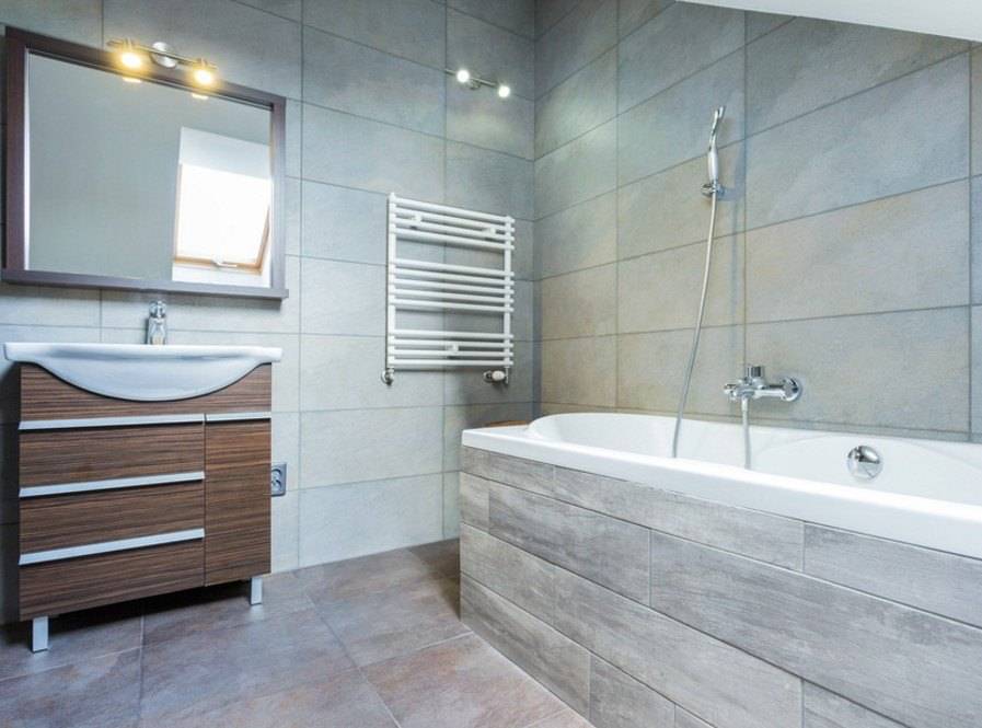 Полотенцесушитель над ванной можно разместить двумя способами: вдоль длинной стороны ванны и вдоль короткой стороны. Такое расположение обогревателя повысит температуру воздуха непосредственно в душевой зоне и сэкономит место в помещении.