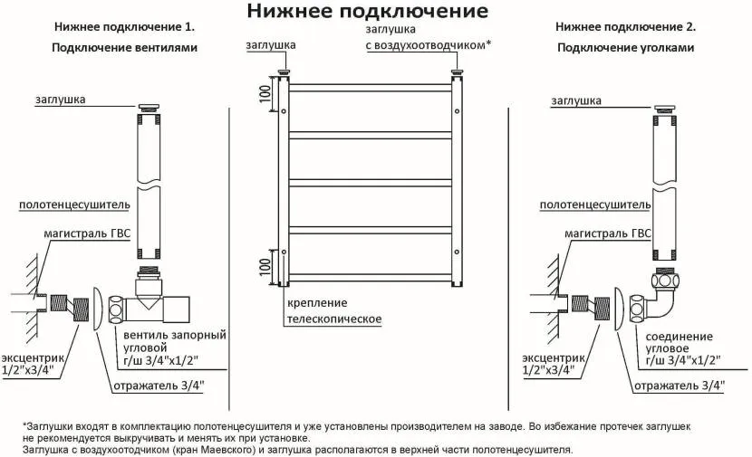 Для самого подключения понадобятся боковые переходники, которые называются уголками, или при помощи вентилей. Такой способ подключения называется нижним.