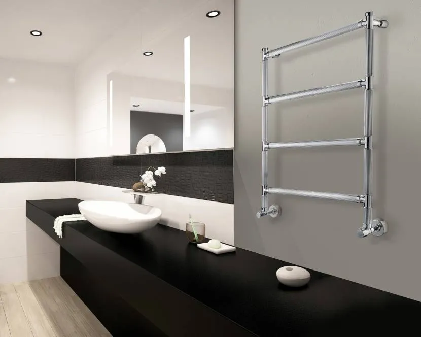 Ноток утонченности и изысканности в интерьер могут привнести водяной полотенцесушитель, выполненный с применением зеркального хромирования