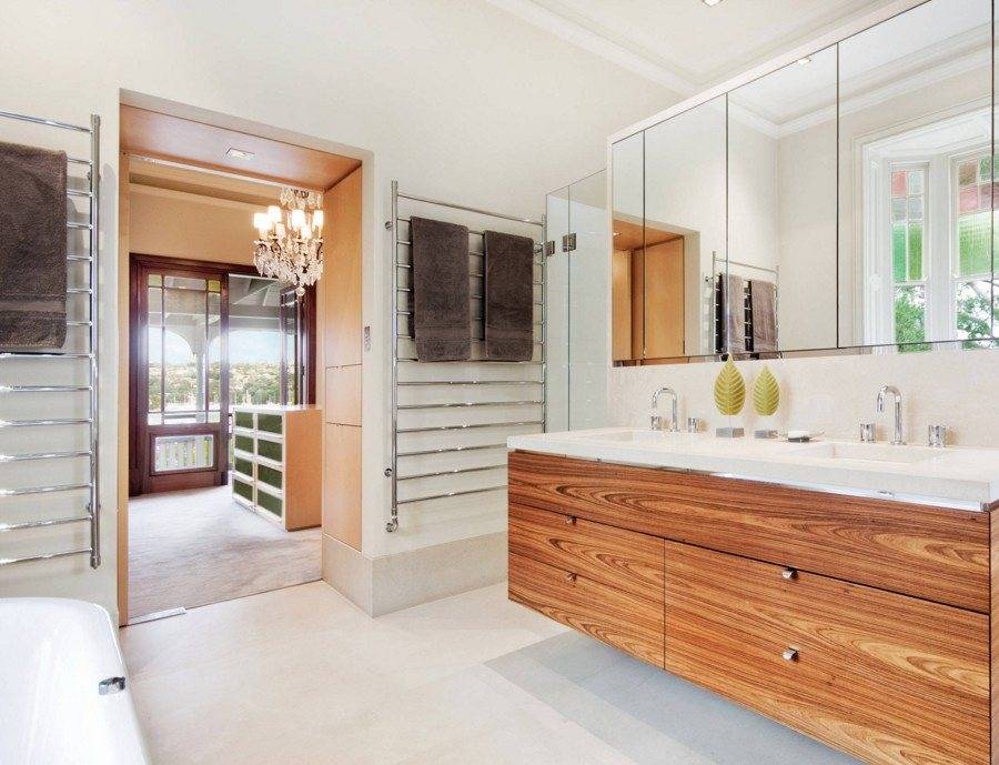 Удобно использовать полотенцесушитель, расположенный на стене рядом с раковиной; под рукой всегда будут горячие сухие полотенца. Это же касается и его размещения в непосредственной близости от унитаза, биде или инсталляции.