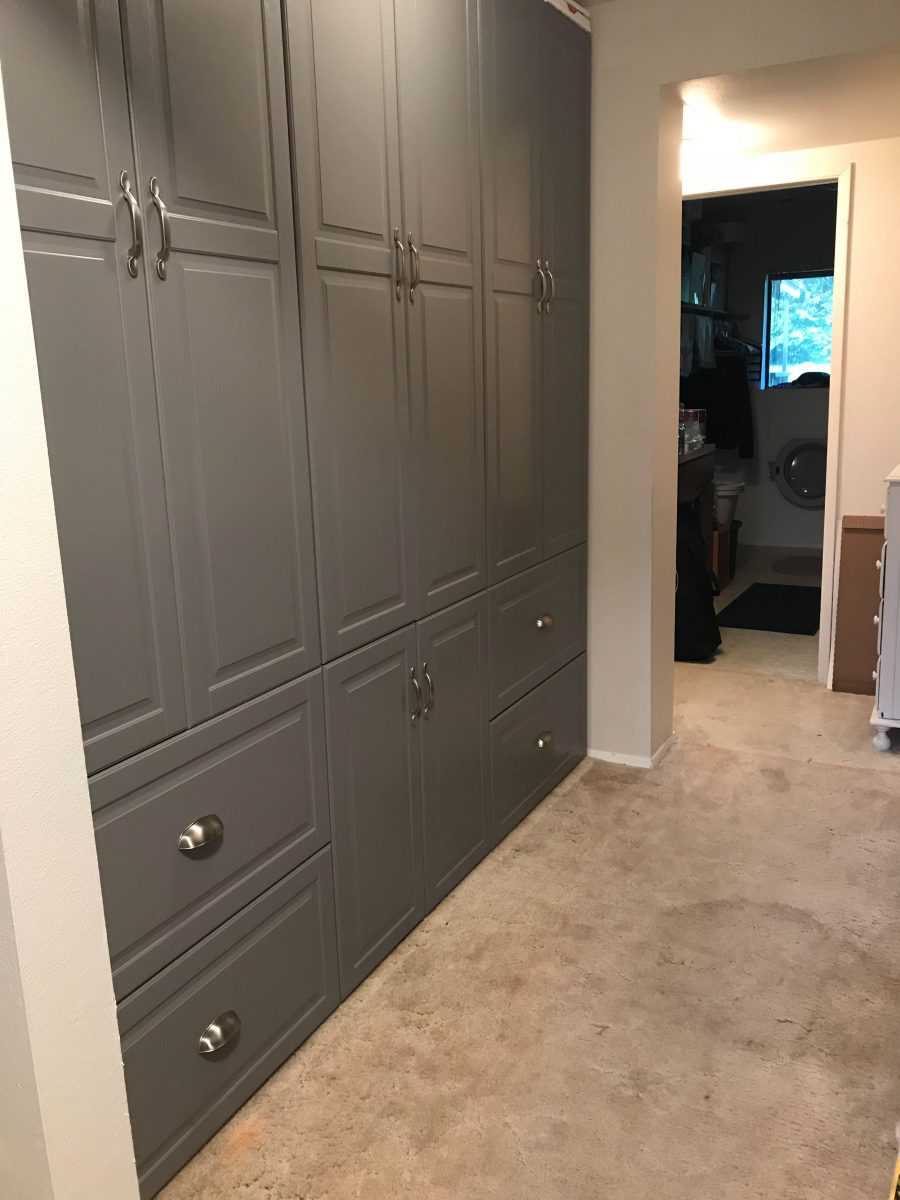 Если такой возможности нет, ставят корпусный шкаф купе. Это полноценный большой шкаф с задней стенкой. боковинами, полом и потолком. Отличается он конструкцией дверей и наполнением. Еще одно отличие — этот вид систем хранения стараются сделать под самый потолок, чтобы максимально использовать все пространство. Да и смотрится это более органично.