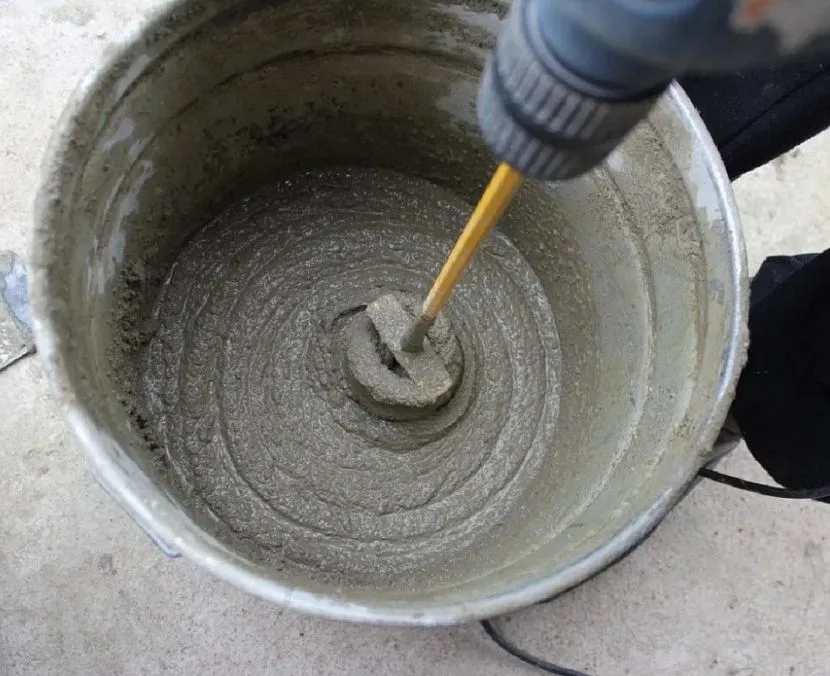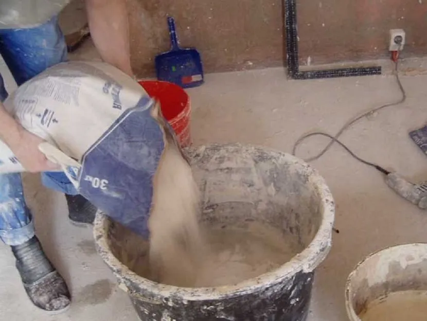 - В ёмкость наливают нужное количество воды. Затем постепенно досыпают цемент и песок, при этом непрерывно размешивая. Если воды будет недостаточно, её добавляют в конце процедуры.