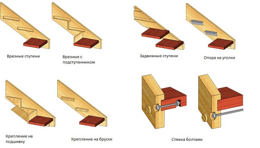 Монтаж лестницы из дерева возможен не только на цельном косоуре, на рисунке ниже представлен вариант сборки косоура с кобылками и вариант сборки тетивы.