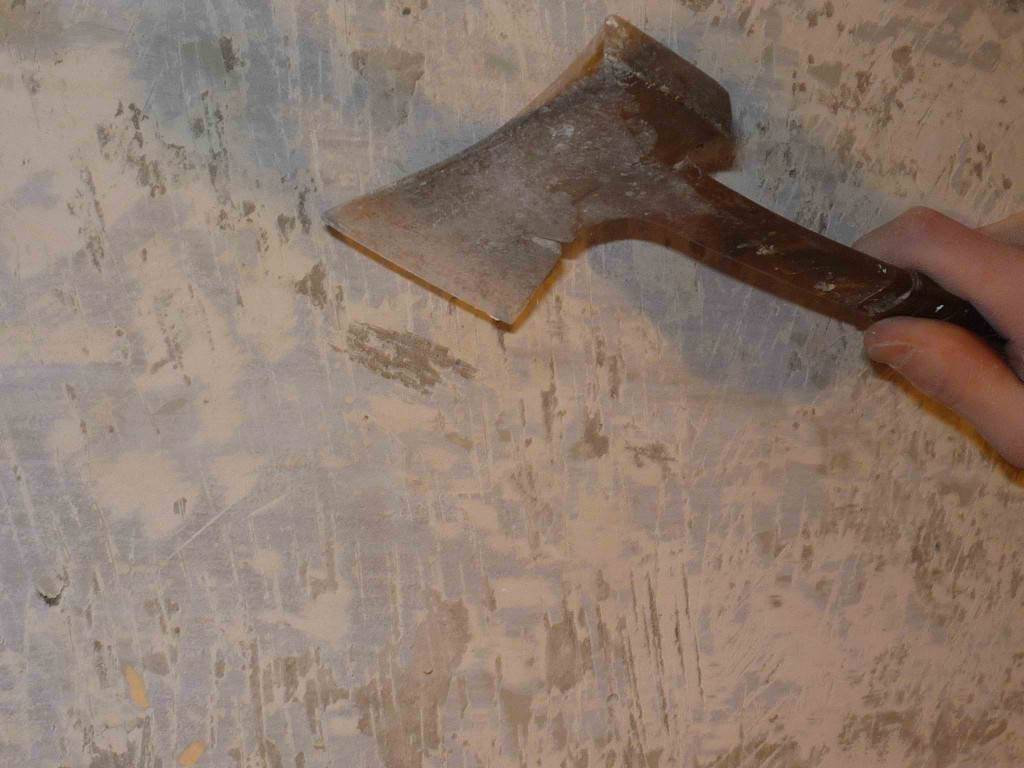 Топором наносят небольшие, но близко расположенные насечки, между которыми краска растрескивается и отваливается. Воду используют для уменьшения пыли, в результате пыль полностью отсутствует. Такая подготовка поверхности очень хорошо подходит для последующего оштукатуривания.