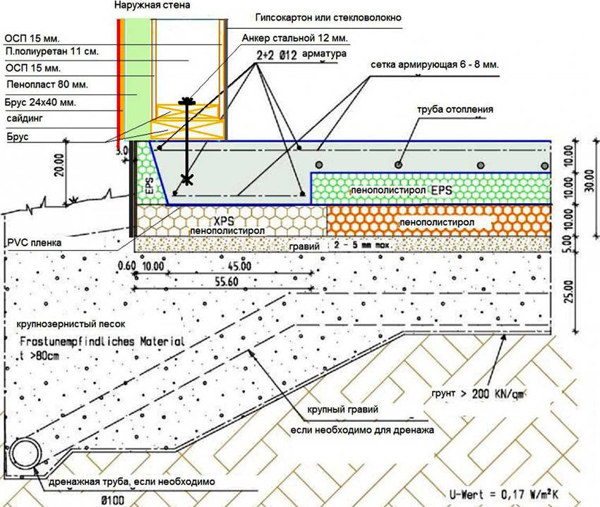 - постоянно отапливаемый дом – грунт под подошвой промерзнуть не может, однако необходимо утеплить отмостку для предотвращения промерзания прилежащих к ж/б конструкциям слоев почвы, которые при вспучивании пытаются фундамент приподнять, либо создать на наружной грани ленты сминаемо-скользящий слой теплоизоляции, который не даст промерзнуть ленте, защитит гидроизоляцию, компенсирует силы пучения;
